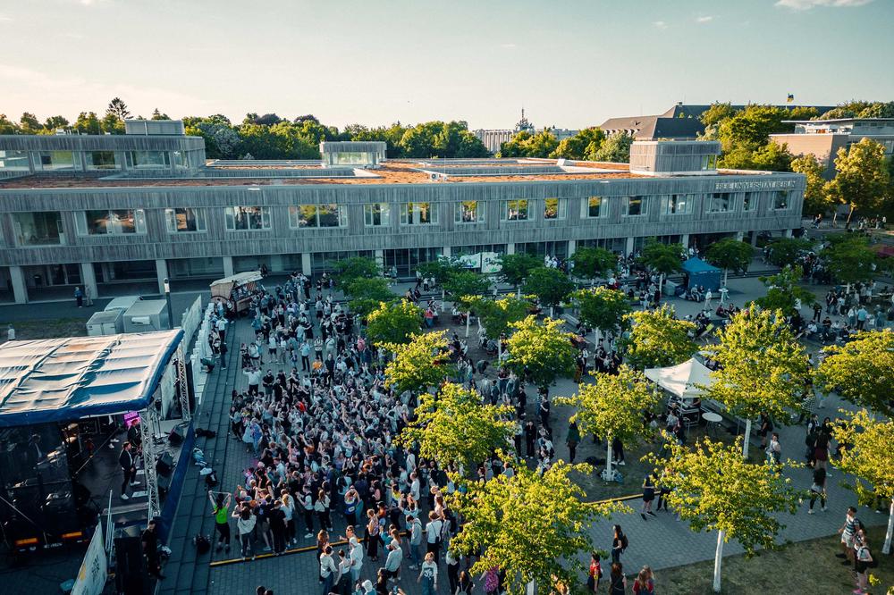 „Das ist etwas Besonderes nach den Corona-Jahren“, freut sich Günter M. Ziegler. Der Präsident der Freien Universität Berlin steht auf der Bühne auf dem Platz vor der Holzlaube. Zwischen den Arkaden, im Schatten der Kirschbäume und in der Sonne haben sich am vergangenen Donnerstag um 17 Uhr schon einige hundert Menschen versammelt. Sie sind gekommen, um nach zwei Jahren Pandemie die Gemeinschaft der Freien Universität zu feiern.