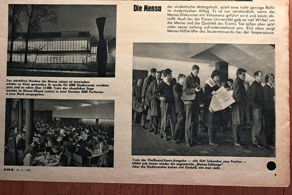 Damals, im August 1963, studierte Volkhard Plonz angewandte Geographie an der Freien Universität und verdiente seinen Lebensunterhalt unter anderemals Hilfskraft in der zehn Jahre zuvor eröffneten Mensa – 1953 hatte die 1948 gegründete Freie Universität einen Neubau für ihre Kantine bekommen. Der Geographiestudent gab Essen am Fließband aus – alle fünf Sekunden eine Portion – und spülte Geschirr. Als die Trauung mit Erika anstand, gab die Belegschaft alles, um dem Paar ein Festmahl zu bereiten.