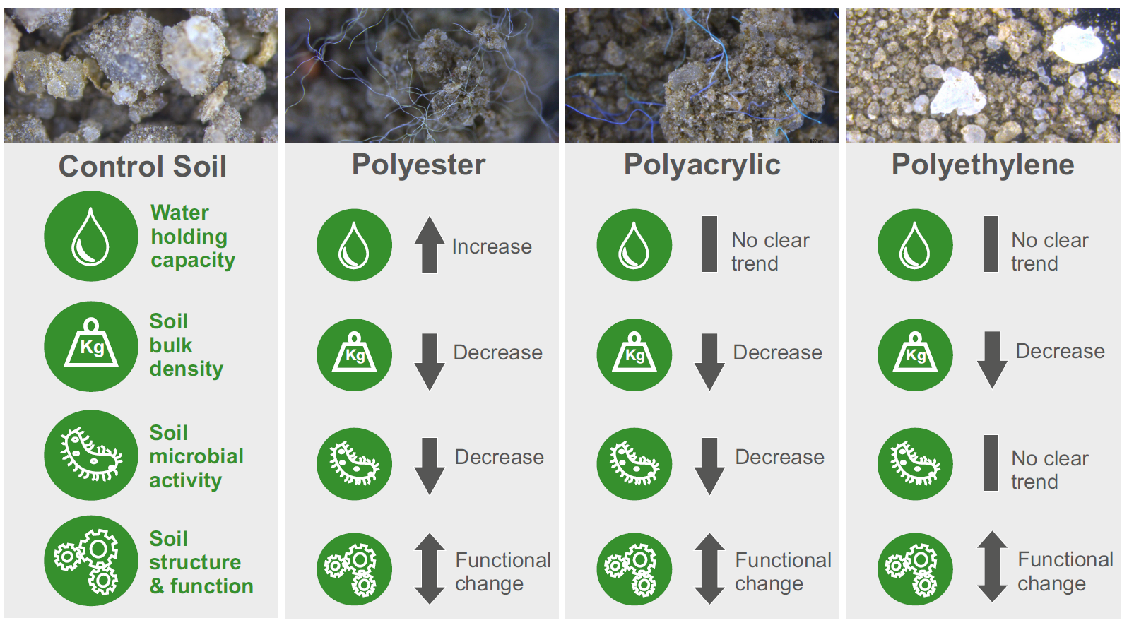 Das Team unter der Leitung des Umweltwissenschaftlers Dr. Anderson Abel de Souza Machado und des Biologen Prof. Dr. Matthias C. Rillig wies bereits in einer früheren Studie auf die Gefahr der Mikroplastikverschmutzung hin. Die neue Forschungsarbeit belegt nun erstmals experimentell die biophysikalischen Auswirkungen von Plastikpartikeln im Boden. Dafür wurde Erde in der Versuchsanordnung mit vier verschiedenen Mikroplastiktypen in steigenden Konzentrationen kontaminiert. Diese Erdproben lagerten die Wissenschaftlerinnen und Wissenschaftler fünf Wochen lang unter natürlichen Bedingungen in einem Versuchsgarten der Freien Universität. Anschließend untersuchten sie den Boden und die Aktivität seiner Mikroben. Das Experiment zeigte, dass Plastikpartikel, insbesondere Polyesterfasern, Einfluss auf grundlegende Struktureigenschaften des Erdreichs und seine Wechselwirkung mit Wasser ausübten. Die sogenannte Lagerungsdichte des Bodens – sie gibt als Kenngröße an, wie dicht Bodenteilchen beieinanderliegen – wie auch die Bildung von Aggregaten, also Erdklumpen, wurden durch das Mikroplastik im Boden beeinträchtigt. Kunststoffpartikel vergrößerten oder verkleinerten die Porenräume der Erde und bestimmten so, wie viel Wasser der Boden aufnehmen konnte. Die Mikroorganismen in den Bodenproben waren dadurch gezwungen, sich an die neuen Umweltbedingungen anzupassen. Ihre Aktivität zeigte Anzeichen funktioneller Veränderungen.