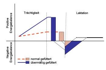 Warum die Übergewichtigen in den Tagen um die Geburt ihre Futteraufnahme im Gegensatz zu normalgewichtigen Kühen beinahe gänzlich einstellen, ist noch ungeklärt. Es führt aber dazu, dass das Ausmaß der negativen Energiebilanz wesentlich größer ist als bei den normal gewichtigen Artgenossen (Abbildung unten).