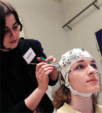 Eine Haube mit Elektroden misst die Hirnströme der Versuchsperson. Erinnerungen können so gemessen und in Kurven sichtbar gemacht werden. Foto:Ulrich Dahl |