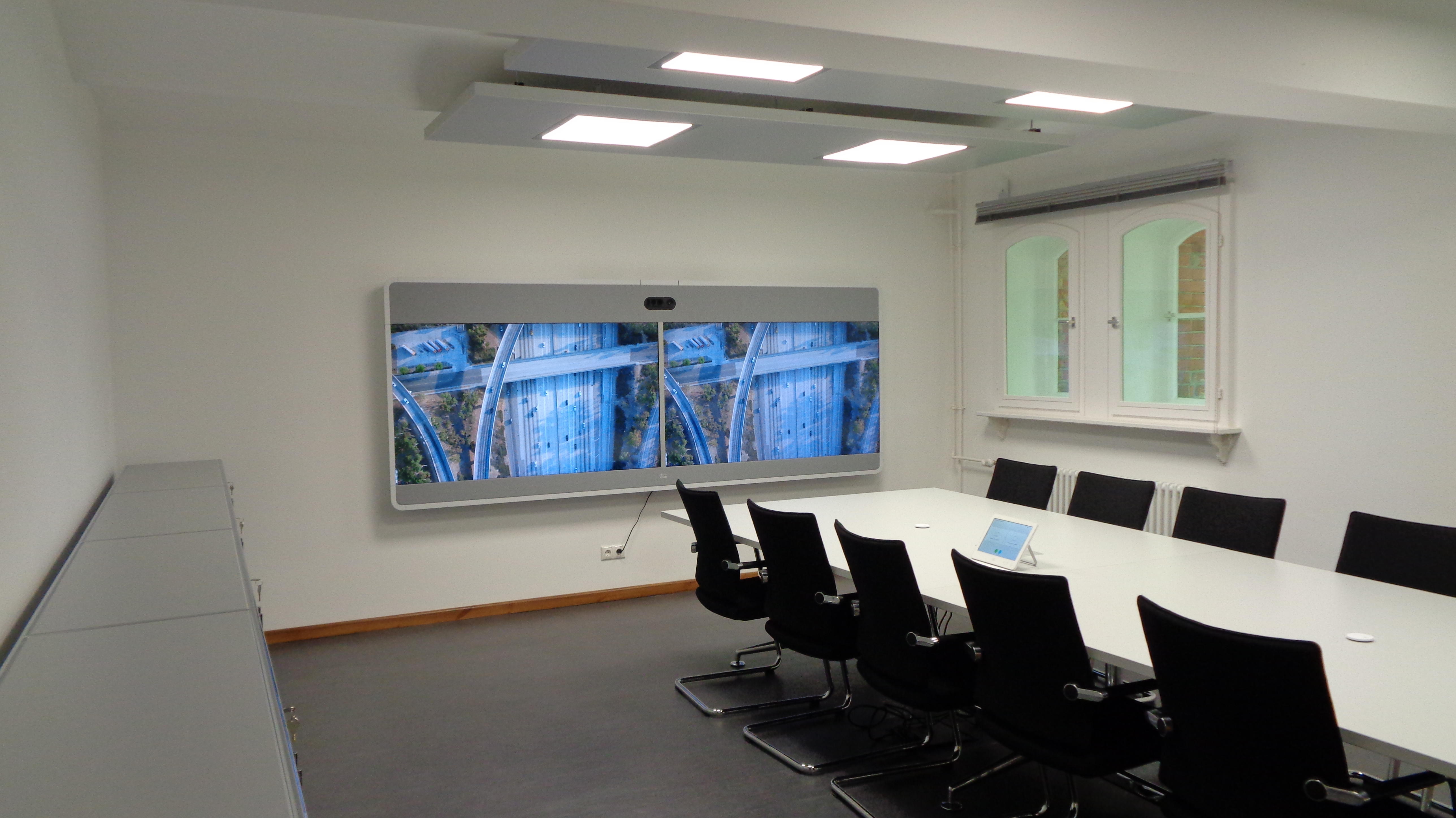 - Videokonferenzsystem mit Anschlußmöglichkeiten für HDMI, USB-C, Apple-TV, Clickshare sowie Netzwerkzugang über Tischeinlass