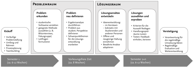 Unser Prozess beginnt mit einer Vorbereitungsphase („Kickoff“), an der Lehrende, Hochschuldidaktiker*innen und am besten von Anfang an Studierendenvertretungen teilnehmen. Dabei klären wir den Auftrag und machen uns mit dem Design-Thinking-Prozess vertraut. Anschließend erkunden wir, wie Studierende das Problem erleben, und bringen diese Erkenntnisse ins Team zurück. Auf dieser Basis bestimmen wir zentrale Handlungsfelder, für die wir neue Lösungsansätze entwickeln und erproben. Durch die enge Zusammenarbeit aller Beteiligten entstehen tragfähige Lösungen, die sich langfristig in der Lehre verankern lassen.