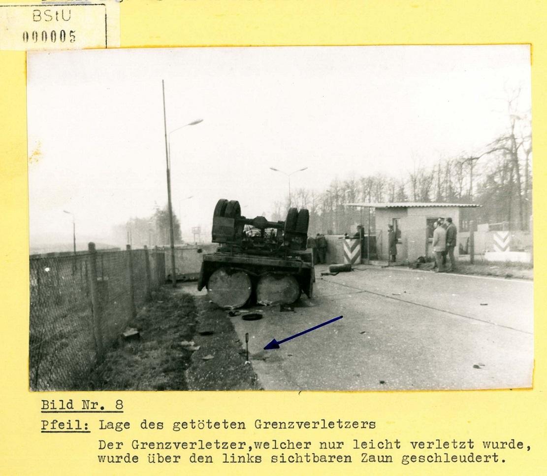 Am 21. April 1973 gegen 1.15 Uhr scheiterte die Flucht der Straßenbauarbeiter Dieter F. (Jg. 1950), Günter W. (Jg. 1952) und Fred Woitke an der letzten Sperranlage in der Grenzübergangsstelle Marienborn. Der Lkw der drei DDR-Flüchtlinge vom Typ “W 50” hatte bereits zwei Schlagbäume durchbrochen und fuhr dann mit etwa 80 km/h gegen die nach Alarmauslösung heruntergefahrene Rollsperre. Das Fahrzeug überschlug sich und blieb auf dem Dach liegen. Fünf DDR-Grenzer hatten zuvor das Feuer auf das herankommende Fahrzeug eröffnet. Günter W. wurde nach dem Aufprall durch die Frontscheibe geschleudert und lag mit mehreren Knochenbrüchen auf der Straße. Dieter F. und Fred Woitke krochen aus dem umgestürzten Lkw und versuchten in Richtung Westen zu flüchten. Der Gefreite Michael G. gab einem MfS-Bericht zufolge vier bis fünf Schüsse auf Dieter F. ab, worauf dieser verletzt liegen blieb. Die anderen vier Grenzer schossen auf Fred Woitke, bis er sich nicht mehr rührte.