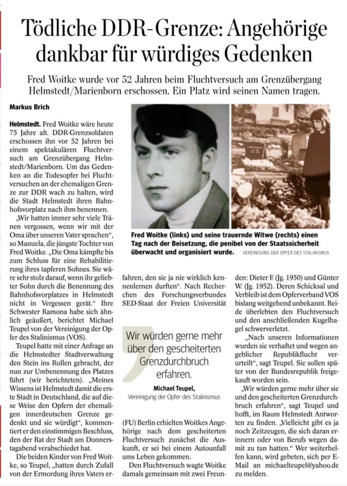 Der Vorplatz des Helmstedter Bahnhofs erhielt auf einstimmigen Beschluss des Stadtrates den Namen Fred-Woitke-Platz. Der Zimmermann und Hobbymusiker Fred (Fredy) Woitke wurde am 21. April 1973 beim Versuch, mit zwei Arbeitskollegen den Kontrollpunkt Marienborn zu durchbrechen, von DDR-Grenzsoldaten erschossen. Siehe https://todesopfer.eiserner-vorhang.de/article/195-fred-woitke/ Für die Ehrung von Fred Woitke hatte sich maßgeblich Michael Teupel von der Vereinigung der Opfer des Stalinismus (VOS) eingesetzt. Teupel sprach am 13. September 2025 auf einer Kundgebung anläßlich der Ehrung für Fred Woitke in bewegenden Worten über das 23jährige Opfer des DDR-Grenzregimes, das nicht in Vergessenheit geraten dürfe. Zu der Veranstaltung anläßlich der Einweihung des Fred-Woitke-Platzes waren auf Einladung der Stadt Helmstedt auch Angehörige seiner Familie erschienen. Die niedersächsische Innenministerin Daniela Behrens und der Helmstedter Oberbürgermeister Wittich Schobert würdigten in ihren Ansprachen den jungen Arbeiter aus Eisenhüttenstadt, auf den DDR Grenzer am 21. April 1973 im Grenzüvergang Marienborn das Feuer eröffneten, als er versuchte, den Zwängen des SED-Regimes nach Westdeutschland zu entkommen. Im Anschluss an die Einweihung des Fred-Woitke-Platzes und der Enthüllung einer dort aufgestellten Stele mit biografischen Angaben zu dem getöteten DDR-Flüchtling fand in der Grenzgedenkstätte Deutsche Teilung Marienborn eine Veranstaltung zur Erinnerung an Fred Woitke statt.