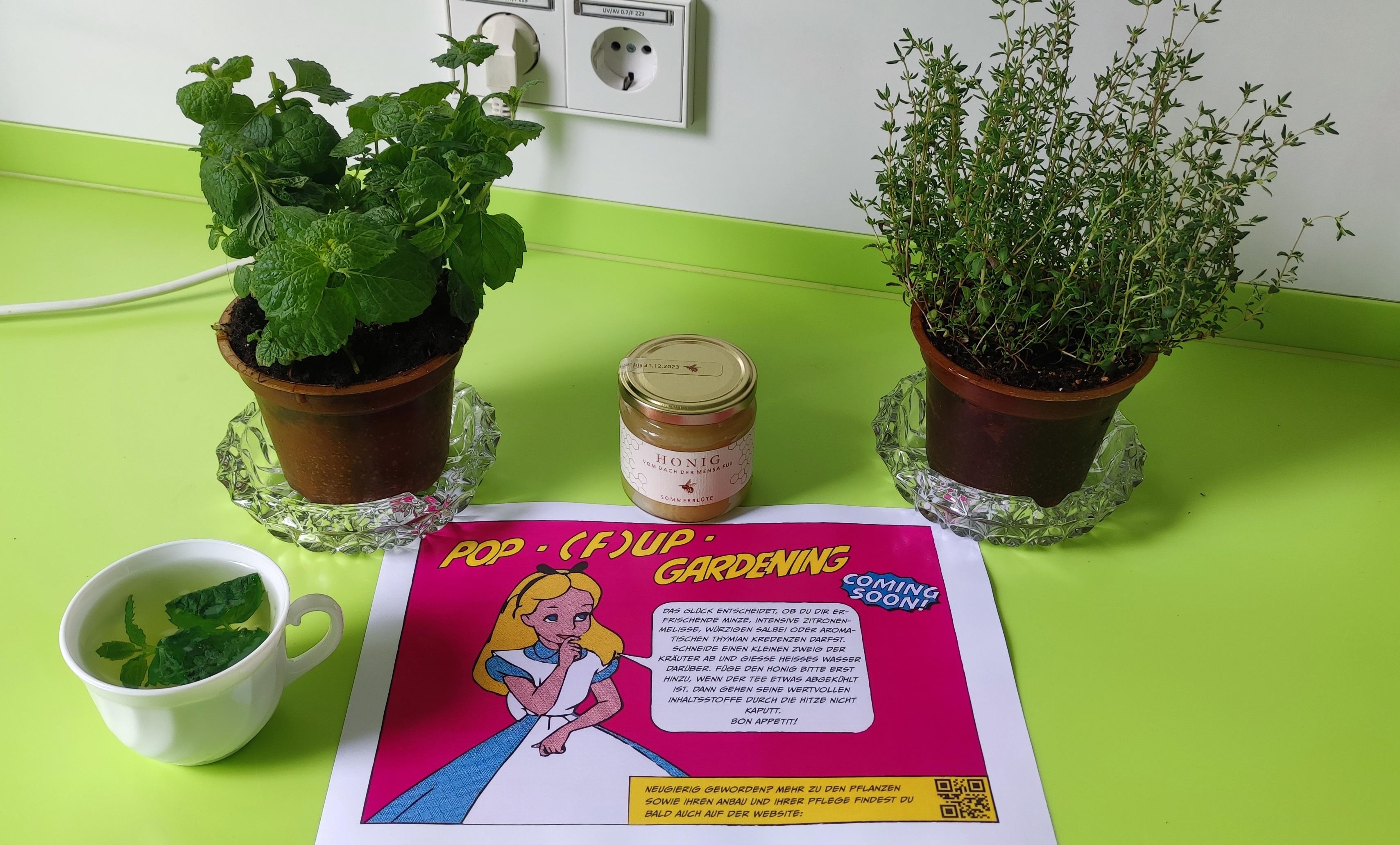 In der Zwischenzeit gab es eine Teeküchenaktion: "Habt ihr uns schon entdeckt? Wir sind Zitronenmelisse, Minze, Salbei und Thymian. Genießt uns heiß als Tee mit lieblichem Honig. Aber auch kalt sind wir sehr erfrischend. Wir lieben es, ein Sonnenbad zu nehmen! Wir - Zitronenmelisse und Minze - brauchen außerdem viel Wasser und sollten immer leicht feucht sein. Hingegen mögen wir - Salbei und Thymian - als mediterrane Kräuter es lieber etwas trockener. Wenn ihr euch gut um uns kümmert, habt ihr lange Freude an uns!"