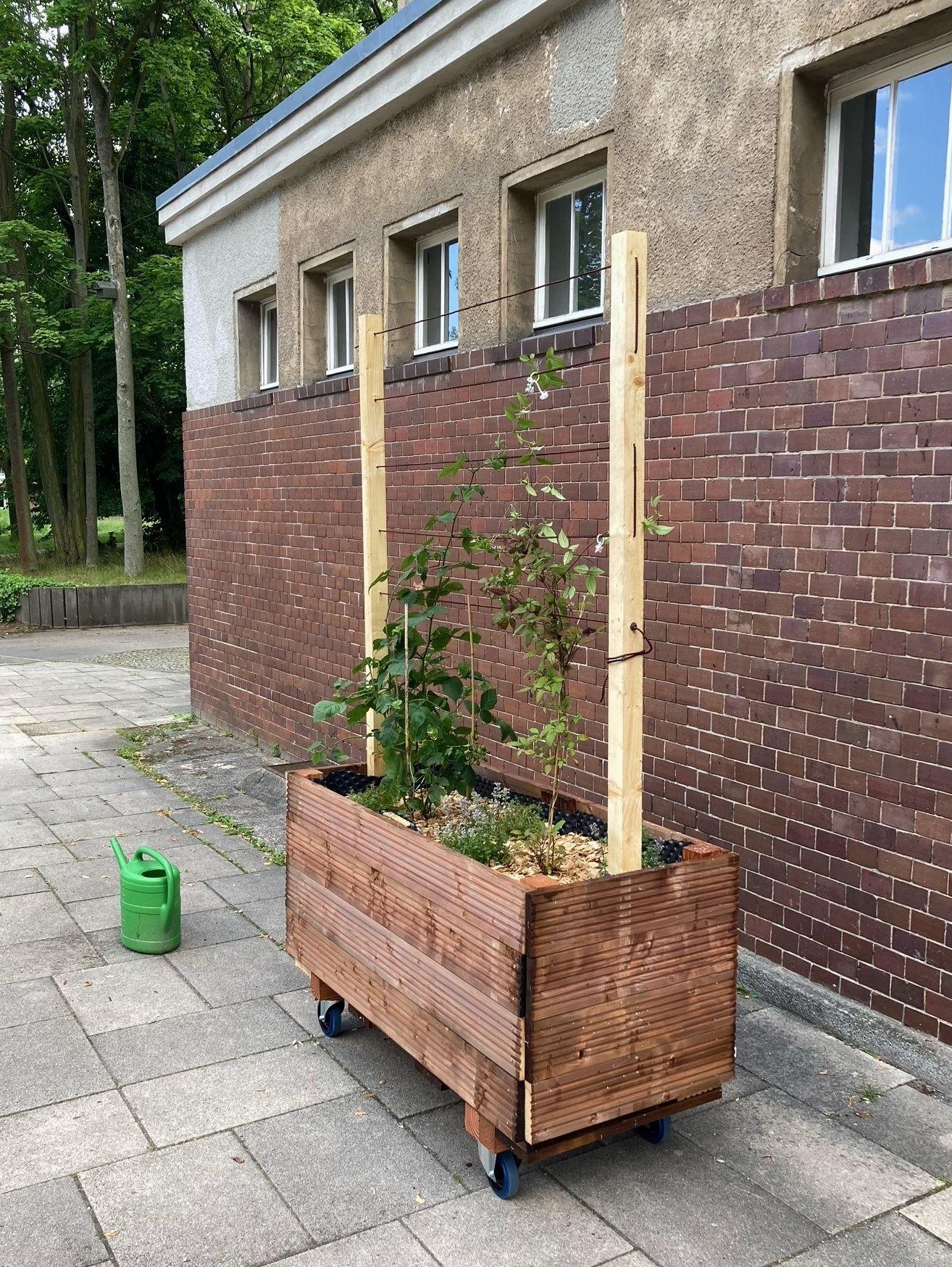 Ursprünglich wollten wir unsere Gebäude mit Drahtseilen und Befestigungen ausstatten und möglichst verschiedene Pflanzen daran hochwachsen lassen. Zudem sind auch freistehende Spaliere aus Holz eine Möglichkeit, um ohne Befestigung an den Wänden unseren Campus zu begrünen.