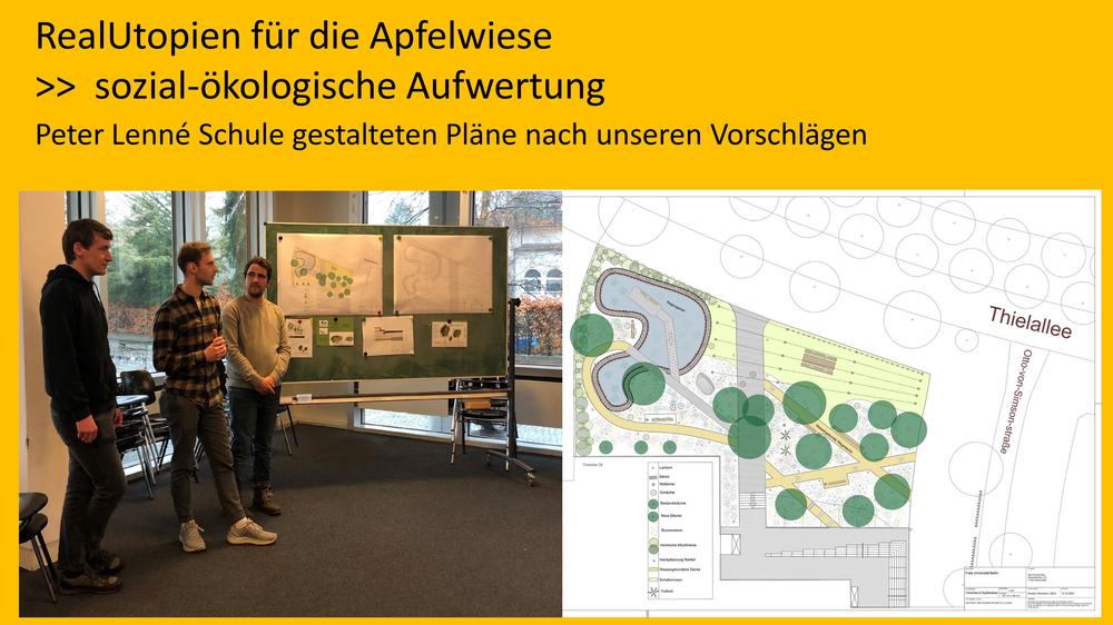 In Kooperation mit der Peter-Lenné-Schule wurden im Dezember 2023 basierend auf unseren Maßnahmenvorschlägen zwei Gestaltungspläne zur Umgestaltung der Apfelwiese entwickelt.