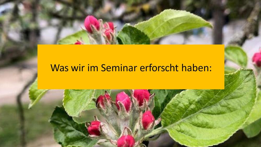 Herzstück des FUturist-Projekts war ein 2-semestriges transdisziplinäres Seminar im ABV-Bereich Nachhaltige Entwicklung. Gemeinsam mit Studierenden und Fachexpert:innen aus dem Fachbereich Geowissenschaften und Biologie sowie mit 14 weiteren Expertpert:innen aus der Stadtgesellschaft, haben wir in einem co-kreativen Miteinander konkrete Maßnahmenvorschläge erarbeitet, wie wir die Apfelbäume und den Boden vitalisieren und die Artenvielfalt von Tieren und Pflanzen fördern können.